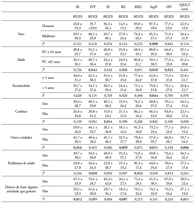O facto de existir outro cuidador comparando com um cuidador que não tem apoio de outro também apresenta diferenças estatísticas significativas na Sobrecarga emocional (t (70) = 2,457; p = 0,016), Reação a exigências (t (70) = 2,699; p = 0,009), Suporte familiar (t (70) = 2,615; p = 0,011) e no score total do QASCI (t (70) = 2,857; p = 0,006). Quem não tem o apoio de outro cuidador apresenta uma SE maior (45,7 ± 30,5), maior sobrecarga na Reação a exigências (32,5 ± 27,7) e maior sobrecarga no score total da escala (39,7 ± 24,3). Por outro lado, a presença de outro cuidador associa-se a um maior Suporte familiar (79,8 ± 29,4). Os resultados espelharam que os PC com problemas de saúde apresentam sobrecarga significativamente pior (t (70) = 2,216; p = 0,032), na dimensão de Mecanismos de eficácia e controlo (72,9 ± 27,0). Também o abandono de uma atividade significativa apresenta valores estatisticamente significativos quando comparados com quem não deixou de fazer uma atividade que gostasse na Sobrecarga emocional (t (70) = 2,590; p = 0,012), Reação a exigências (t (70) = 2,828; p = 0,007) e ao score total do QASCI (t (70) = 2,621; p = 0,011). Os PC que deixaram de realizar a atividade que gostavam revelam maior Sobrecarga emocional (47,5 ± 33,9), maior Reação a exigências (34,1 ± 27,5) e uma sobrecarga total superior (40,0 ± 22,4; Tabela 2).