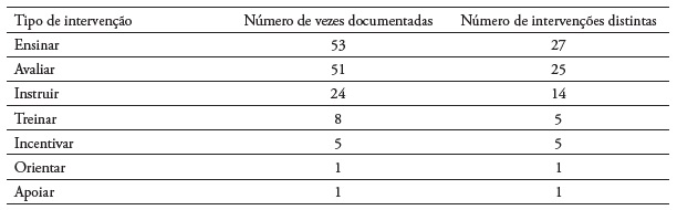 As intervenções do tipo “Ensinar” são efetivamente as mais representativas, no entanto também as intervenções do âmbito do “Instruir” e “Treinar” são documentadas, correspondendo à aquisição de competências para o novo papel. Este tipo de intervenções pode refletir uma abordagem centrada no “saber fazer” e na necessidade do PC de adquirir conhecimentos para suprir as necessidades do seu familiar em situação de dependência.