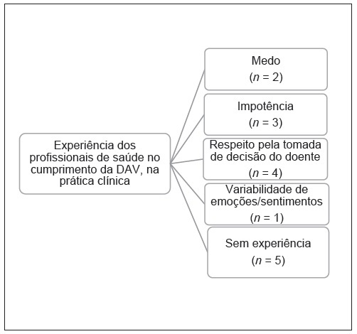 De forma a se obter uma perceção mais objetiva, expomos em forma de figura as experiências dos profissionais de saúde no cumprimento da DAV, na prática clínica (Figura 1).