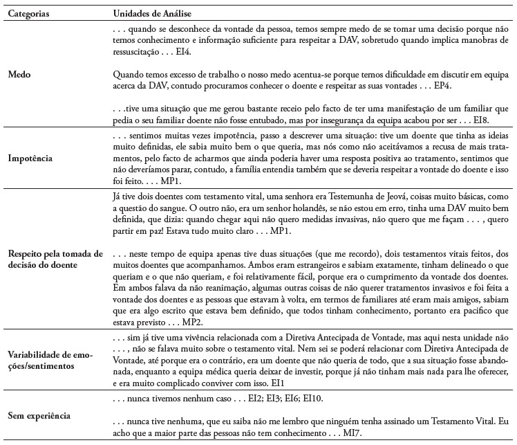 De seguida, apresentamos os dados recolhidos em entrevista aplicada aos profissionais de saúde que participaram no estudo, em 2018 e 2019. De forma a possuir uma perceção mais clara das categorias apresentadas, expomos e analisamos as unidades de análise inerentes à temática as experiências dos profissionais de saúde no cumprimento da diretiva antecipada de vontade, na prática clínica, como apresentado na tabela 1.