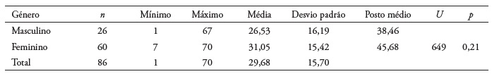 A aplicação do ICG permitiu identificar um score mínimo de 1 e um máximo de 70, com uma média global de 29,68 (desvio padrão ± 15,70). Os resultados mostram não existirem diferenças estatisticamente significativas entre os géneros (U = 649; p = 0,21; Tabela 1).