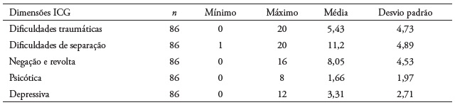 O ICG é constituído por 19 itens, com respostas tipo Likert de 5 pontos (Nunca a Sempre), de 0 a 4, com uma pontuação total que varia entre 0 e os 76 valores, que permitem avaliar a existência de sintomas de luto, como consequência da perda de uma pessoa significativa, decorrido um mês. Apenas pode falar-se em luto complicado/patológico após decorrerem seis meses desde o evento. A versão portuguesa da escala apresenta cinco dimensões: 1. Dificuldades traumáticas (itens 2, 9, 10, 11 e 12); 2. Dificuldades de separação (itens 1, 4, 5, 13 e 19); 3. Negação e revolta (itens 3, 6, 7 e 8); 4. Psicótica (itens 14 e 15); e 5. Depressiva (itens 16, 17 e 18). Uma pontuação acima dos 25 valores, num caso de perda superior a 6 meses, indica a probabilidade de existir luto complicado (Frade, 2010). O estudo da consistência interna do ICG, para a amostra em estudo, revela uma consistência muito boa (a = 0,93).