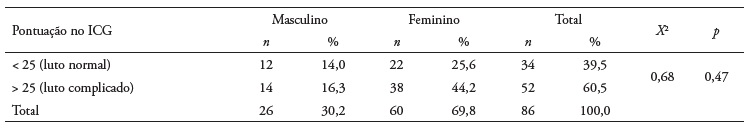 Em relação à tipologia do luto constata-se que 52 participantes (60,5%) apresentaram um score superior a 25 pontos, evidenciando um processo de luto complicado. Não se verificaram diferenças estatisticamente significativas entre os géneros (X2 = 0,68; p = 0,47) (Tabela 3).