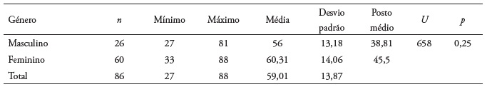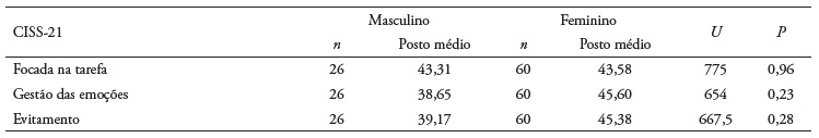 Relativamente à aplicação do CISS-21, o score do coping oscilou entre um mínimo de 27 e um máximo de 88, com uma média global de 59,01 (desvio padrão ± 13,87). Não se verificaram diferenças estatisticamente significativas entre os géneros (U = 658; p = 0,25; Tabela 4).