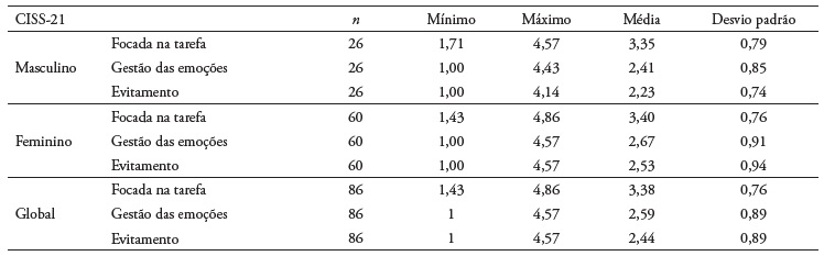 A análise dos resultados obtidos pelo CISS-21 revela que as estratégias associadas a estar “focada na tarefa” (M = 3,35, desvio padrão ± 0,79) são as mais adotadas pelos participantes do género masculino, seguidas das práticas associadas à “gestão das emoções” (M = 2,41, desvio padrão ± 0,85) e de “evitamento” (M = 2,23, desvio padrão ± 0,74). Os participantes do género feminino também utilizam a estratégia “focada na tarefa” (M = 3,40, desvio padrão ± 0,76) com maior frequência, seguidas das estratégias “gestão das emoções” (M = 2,67, desvio padrão ± 0,91) e de “evitamento” (M = 2,53, desvio padrão ± 0,94). A estratégia “focada na tarefa” é a mais adotada por todos os participantes, com um valor médio de 3,38 (desvio padrão ± 0,76) no score global (Tabela 5).
