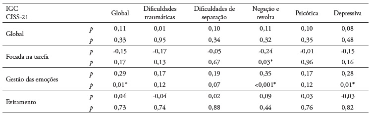 Da análise das correlações do score global do CISS-21 com os itens individuais do IGC, extrai-se uma correlação positiva para o item 6 (p = 0,32; p = 0,003). Em relação à correlação entre os itens individuais do IGC e a dimensão Focada na tarefa verificámos correlações negativas para o item 7 (p = -0,24; p = 0,02), o item 8 (p = -0,28; p = 0,01) e o item 9 (p = -0,26; p = 0,01). Em relação à correlação entre os itens individuais do IGC e a dimensão Gestão de emoções verificámos correlações positivas para o item 3 (p = 0,22; p = 0,04), o item 6 (p = 0,46; p < 0,001), o item 7 (p = 0,26; p = 0,01), o item 8 (p = 0,24; p = 0,03), o item 9 (p = 0,21; p = 0,05), o item 13 (p = 0,23; p = 0,03), o item 14 (p = 0,22; p = 0,05) e o item 17 (p = 0,27; p = 0,01). Por fim, ao analisarmos a correlação entre os itens individuais do IGC e a dimensão Evitamento verificámos apenas uma correlação positiva para o item 6 (p = 0,27; p = 0,01).