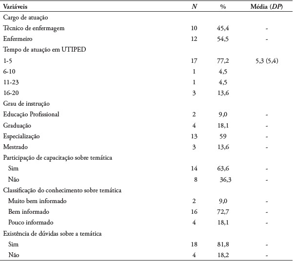 Os participantes do estudo foram os enfermeiros e técnicos em enfermagem integrantes efetivos da Unidade de Terapia Intensiva Pediátrica (UTIP) que puderam estar presentes no momento da intervenção educativa. Assim, participaram do estudo 22 profissionais, sendo 12 enfermeiros e 10 técnicos em enfermagem, do total de 26 profissionais de enfermagem que compõem a força de trabalho do setor, enquadrando o estudo como piloto.