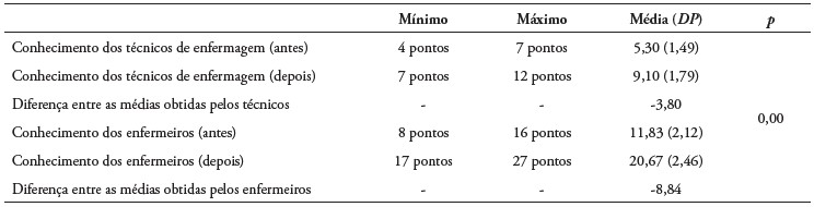 Resultados: Aumento do conhecimento teórico após intervenção, com aumento da média da pontuação dos técnicos em enfermagem de 5,30 (DP = 1,49) para 9,10 (DP = 1,79) e enfermeiros de 11,83 (DP = 2,12) para 20,67 (DP = 2,46).