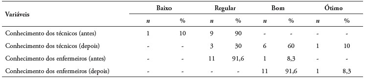 Os dados da Tabela 3 mostram que, antes da intervenção educativa, 10% dos técnicos em enfermagem obtiveram uma pontuação baixa e 90% pontuação regular. Entretanto, após a intervenção, nenhum técnico permaneceu na categoria de baixa pontuação. Quanto aos enfermeiros, antes da intervenção educativa, 91,6% deles obtiveram uma pontuação regular e apenas 8,3% alcançaram a categoria bom. Entretanto, após a intervenção, 91,6% passaram para a categoria bom e 8,3% para ótimo. Portanto, tanto os enfermeiros quanto os técnicos em enfermagem apresentaram evolução em suas categorias de pontuação após a intervenção.