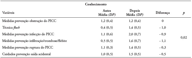 Com base nos resultados apresentados, pode-se perceber que a estrutura cognitiva dos profissionais de enfermagem foi modificada em um sentido positivo, visto que, após um mês da intervenção educativa, houve incremento das médias do conhecimento de 3,80 para os técnicos e 8,84 para os enfermeiros. Destaca-se que não foram localizados estudos relacionados ao efeito de uma intervenção educativa no conhecimento dos profissionais sobre o cuidado com PICC.
