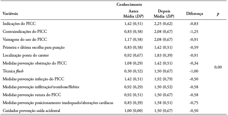 Para os técnicos em enfermagem, a maior diferença de médias esteve nas questões relacionadas com a técnica correta para realização do flush, bem como com as medidas para prevenção de infiltração/trombose/flebite e infeção do PICC. Já para os enfermeiros, a diferença esteve nas questões que abordavam as indicações e contraindicações para inserção do PICC, na técnica correta do flush, nas vantagens do uso do PICC e n localização correta da ponta do cateter. Vale destacar que o p foi de 0,00 em todos os itens analisados.