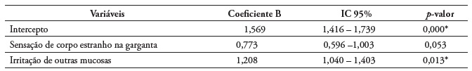 Para a análise da interação entre a exposição e os principais sinais e sintomas apresentados foi realizada a regressão de Poisson com ajuste para sensação de corpo estranho na garganta e irritação de outras mucosas. De acordo com este modelo de predição, a exposição do G1 ao fumo cirúrgico aumenta 1,56 vezes o risco de apresentar sinais e sintomas (p = 0,000). A presença de sensação de corpo estranho na garganta foi limítrofe para definição do modelo de ajuste, enquanto a irritação de outras mucosas contribuiu com um aumento de 1,20 vezes no risco de apresentar outros sinais e sintomas associados a exposição ao fumo cirúrgico (p = 0,013), conforme apresentados na Tabela 2.