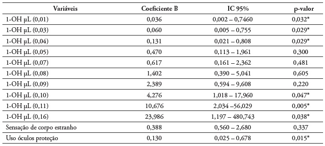 Quanto maior os níveis de 1-OHP na urina maiores chances de desenvolvimento de sinais e sintomas demonstrada pela sensação de corpo estranho na garganta neste modelo. Quando os níveis de 1-OHP atingem seu valor máximo neste grupo de 0,16 o risco é de 23,98 vezes o aparecimento de sintomas. Já o uso dos óculos de proteção apresentou-se como fator protetor reduzindo o risco de apresentar sinais e sintomas em 13% (p-valor 0,015). Para análise de interação entre as diferentes concentrações de 1-OHP na urina ao final do turno de trabalho e o principal EPI utilizado, os óculos de proteção, foi realizada a regressão linear multivariada apresentada na Tabela 3.