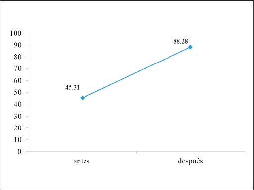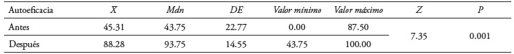 Finalmente, en la Tabla 4 se muestra la prueba de Wilcoxon para contrastar las medidas de tendencia central de la autoeficacia antes y después de la práctica de enfermería simulada. Los resultados muestran diferencias estadísticamente significativas, lo que indica que la autoeficacia para la práctica de enfermería se incrementa después de la simulación. En la Figura 1 se muestra gráficamente el incremento de la autoeficacia después de la práctica simulada.