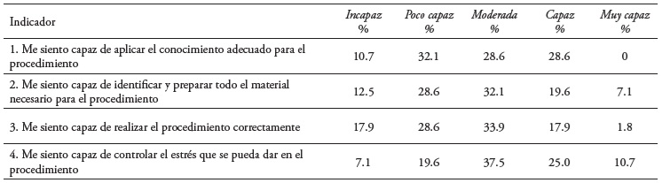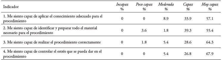 En la Tabla 1 se muestran los indicadores de la percepción de autoeficacia antes de realizar la práctica de enfermería simulada y se observa que solo 28.6% se siente capaz o muy capaz en aplicar adecuadamente los conocimientos, 26.7% en preparar el material necesario, 19.7% en realizar el procedimiento correctamente y 35.7% en controlar el estrés durante el procedimiento.