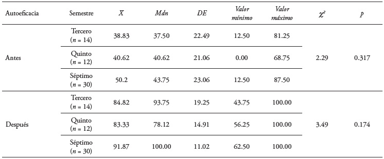 En la Tabla 3 se observa el contraste de tendencia central de la puntuación de la autoeficacia antes y después de la práctica de enfermería simulada por semestre, los resultados de la prueba de Kruskal-Wallis no muestran diferencias significativas, es decir que la autoeficacia percibida antes y después de la práctica simulada no es diferente por semestre.
