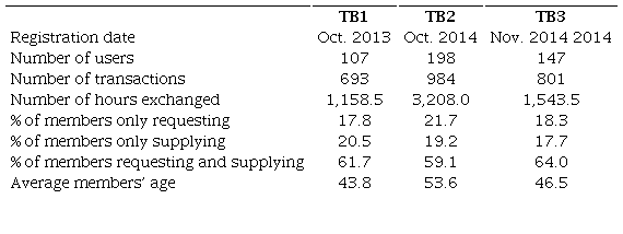Our data set comes from three time banks (TB1, TB2, and TB3, hereafter) located in Barcelona and registered with TimeOverflow, a free software program designed to handle transactions taking place in a bulk of time banks in Spain and Latin America. This online platform was created by CoopDevs, an open-source company developing software for the social and solidarity economy, and is offered by the Spanish Association for the Development of Time Banks to time banks interested in using it. Time bank activity in this data covered a time span that ranged between two and three years, ending in October 2016. The information available for each bank included the location, the registration date in the online system, the number of users, and the number of exchanges. For each exchange, there was information about the users involved, the exchange date, and the number of offered and requested hours. For all members, the available information included their ages, registration dates on the online system, trading partners and balance in terms of exchanged hours. 1 Unfortunately, we do not have information on the type of services exchanged (housekeeping, lessons, etc.). Thus, our analysis is not based on what services members exchanged, but on how many hours they exchanged (offers and/or demands) and with whom, i.e., their trading network characteristics.