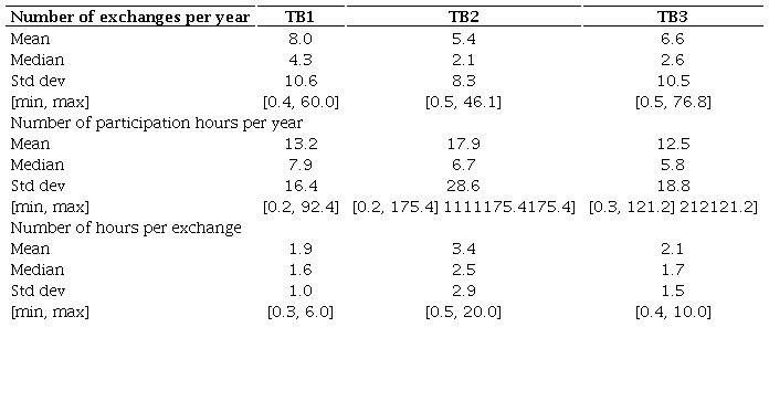 The data also allows us to obtain some individual indicators to analyze members' activity in terms of exchanges and participation hours. Table 2 displays the number of exchanges and participation hours by member in each bank as well as the number of hours per exchange. It is worth making two comments: firstly, the bank registration date ranged from October 2013 to November 2014, as shown in Table 1, the available period of data being three years for TB1 and two years for TB2 and TB3; secondly, users may have registered at any period since the time bank’s creation, which means that there is heterogeneity in the period they have been active. To obtain comparable figures across members in the three banks, Table 2 includes the number of transactions per member and year for members who were active for at least one year. This represents around 79% of users in TB1 and 87% in TB2 and TB3. The average number of exchanges per member and year was 8 in TB1, 5.4 in TB2, and 6.6 in TB3; the median values were much lower, 4.3, 2.1, and 2.6, respectively, thus reflecting a heavy right tail that corresponded to a very small number of active members, with more than 45 exchanges per year (the maximum was almost 80 exchanges in TB3). Regarding the average number of participation hours per member and year, the data shows that they were quite similar in TB1 and TB3, around 13 hours, while in TB2 the figure was higher, at 18 hours. The differences were less marked in the median values (around 8, 7 and 6 hours in the three banks, respectively), reflecting the asymmetry of the distribution, especially in TB2. It is worth mentioning that more exchanges do not necessarily imply more participation hours. The bottom panel of Table 2 reports the number of hours exchanged per transaction. The duration of the exchanges were decided by the members involved meaning that they did not necessarily all last for one hour. Indeed, the average duration of a transaction ranged from 2 hours in TB1 and TB3 to 3.4 in TB2, meaning that it was almost 70% higher in TB2 than in the other two banks. Although the difference was not so marked in the median, standing at around 1.7 hours in TB1 and TB3 and 2.5 hours in TB2, it was still 50% higher in the latter.