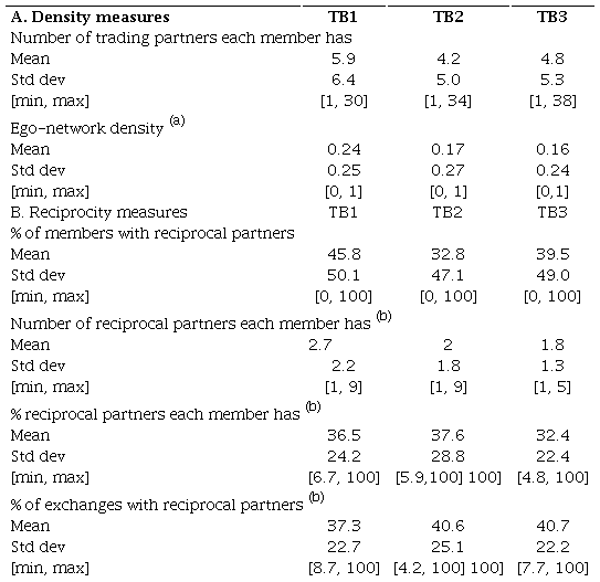 Time banking goes beyond exchanging hours in provided or received services. It also offers an opportunity for community interactions, as stated in the extensive literature that has focused on time banks from different perspectives (see Section 2). Social network creation and reciprocity behavior which may arise from community interactions are two of the core values of time banking ( Cahn, 2000; Seyfang, 2006). Indeed, one of the main goals of time banks is to build social capital. As we have mentioned, this article contributes to the literature that explores the capacity of time banks to promote social capital. To the authors’ knowledge, this is the first article that has explored this issue for the Spanish case using transaction data. It focuses on two different aspects of social capital that have been named in the theoretical literature as bonding and bridging social capital ( Gittell & Vidal, 1998). In the context of time banking, this article follows Collom (2012), who identified bonding social capital indicators as the density of the network and the existence of reciprocal contacts, both of which are related to trust-based relationships among members. Bridging social capital refers to interactions that members establish with others who are dissimilar to them in some characteristics. These two perspectives have allowed us to test whether social capital is created around time bank activity and to what extent this phenomenon promotes relationships among members that would otherwise probably not take place. With these links, users do not only exchange services, but they also have the potential to create personal relationships, thus increasing social well-being 2. Table 3 reports some bonding social capital indicators related to the network properties for the three time banks analyzed. Panel A shows measures related to the network density, while Panel B offers some reciprocity measures.