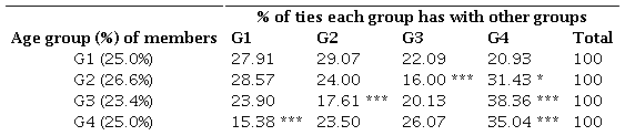 Table 4 displays the results of a test that compared the observed ties with the expected ties under the assumption of neutral preferences. The unit of observation was the tie (i,j), composed of a reference member i and his/her partner j. We considered the age group for all the reference members and that of all their partners in the observed ties. The first column reports the relative size of each age group. If preferences were neutral, the expected percentage of ties with each group resembled the relative group size. The figures in the second to fourth columns are the observed preferences, i.e., the percentage of ties with each group (corresponding to the bar heights in Figure 3). In the cases marked with an asterisk, the null hypothesis of neutral preferences was rejected. This happened in all groups, except in G1 (first row). Members in G2 (second row) interacted with those in G3 with a significantly lower frequency than expected under neutral preferences (16% being the observed frequency vs. 23.4% if preferences were neutral); the opposite was found in their interactions with G4 members (31.43% vs. 25%). Regarding G3, the frequency of ties with G2 was lower than expected under neutral preferences (17.61% vs. 26.6%) but was higher than expected with G4 (38.36% vs. 25%). Finally, in G4, the frequency of internal ties was significantly higher than expected under neutral preferences (35.04% vs. 25%); the opposite was true for the frequency of external ties with the youngest members, those in G1 (15.38% vs. 25%).