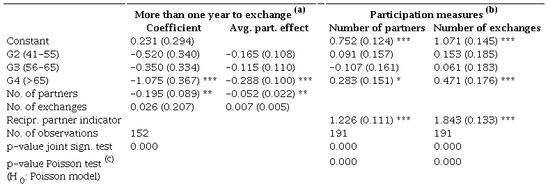 where yi was a measure of participation. We took two measures into account, the number of partners and the number of exchanges; Dig was the age group indicator for individual i (G1 is the reference group) and xi was an indicator of whether the user had reciprocal partners. According to Panther (2012), those with reciprocal transactions tend to be more active in exchanges and have more partners. We employed negative binomial models, which controlled for the potential overdispersion found in many applications with microdata. The results show that the elderly members had, on average, 28% more partners and were involved in 47% more exchanges than the youngest ones. As we have already mentioned for the previous models, the interpretation of the estimation results is descriptive rather than causal.
