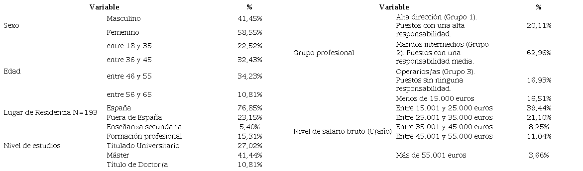 De acuerdo con este dato, el perfil sociodemográfico y laboral obtenido en esta investigación se detalla en la Tabla 1. En este sentido, el perfil de las personas que han participado en el estudio se corresponde con el de mujeres (58,55%) residentes en España (76,85%), con una edad entre 46 y 55 años (34,23%), con tienes una titulación de postgrado (41,44%) y que ocupan puestos de trabajo con una responsabilidad media (62,96%), cuentan con unos ingresos brutos entre 15.000 y 25.000 euros (39,44%).