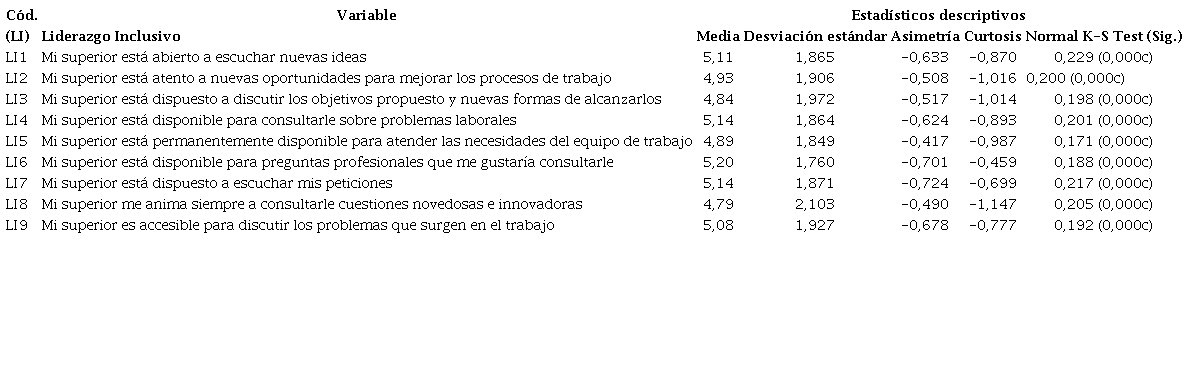 El análisis descriptivo de las variables en estudio está presentado en la Tabla 2 y la tabla 3. Así, en cuanto a la percepción del estilo de liderazgo inclusivo (LI), la tabla 2 presenta que el valor medio más alto (5,2) se corresponde con la disponibilidad que las personas empleadas tienen para realizar consultas de índole profesional a su superior (LI6).