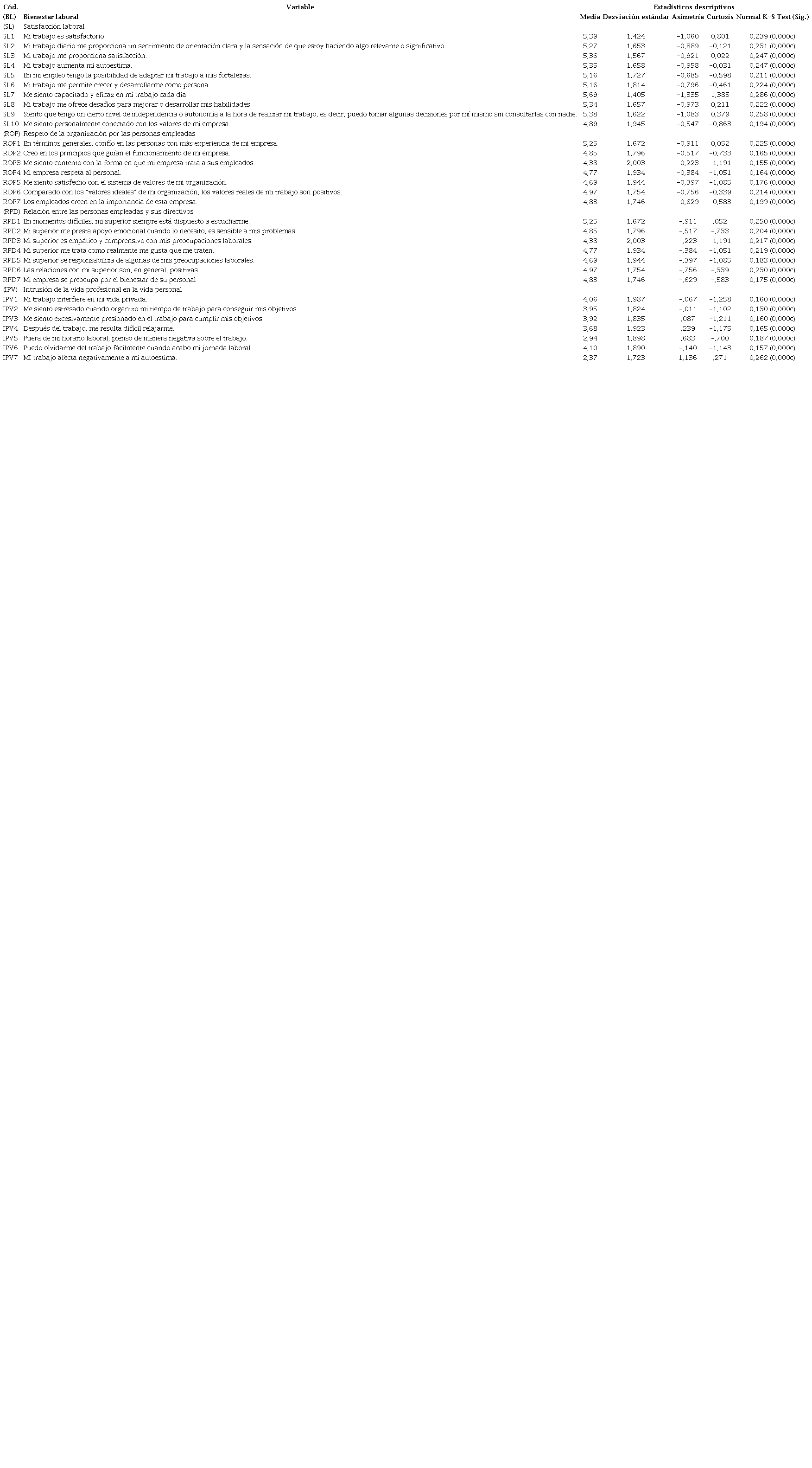 Por otro lado, en relación con el bienestar laboral y de acuerdo con las cuatro dimensiones definidas por Parker y Hyett (2011), se señalan a continuación los indicadores utilizados para medir la satisfacción laboral (SL): mi trabajo es satisfactorio (SL1), mi trabajo diario me proporciona un sentimiento de orientación clara y la sensación de que estoy haciendo algo relevante o significativo (SL2), mi trabajo me proporciona satisfacción (SL3), mi trabajo aumenta mi autoestima (SL4), en mi empleo tengo la posibilidad de adaptar mi trabajo a mis fortalezas (SL5), mi trabajo me permite crecer y desarrollarme como persona (SL6), me siento capacitado y eficaz en mi trabajo cada día (SL7), mi trabajo me ofrece desafíos para mejorar o desarrollar mis habilidades (SL8), siento que tengo un cierto nivel de independencia o autonomía a la hora de realizar mi trabajo, es decir, puedo tomar algunas decisiones por mí mismo sin consultarlas con nadie (SL9) y me siento personalmente conectado con los valores de mi empresa (SL10).
