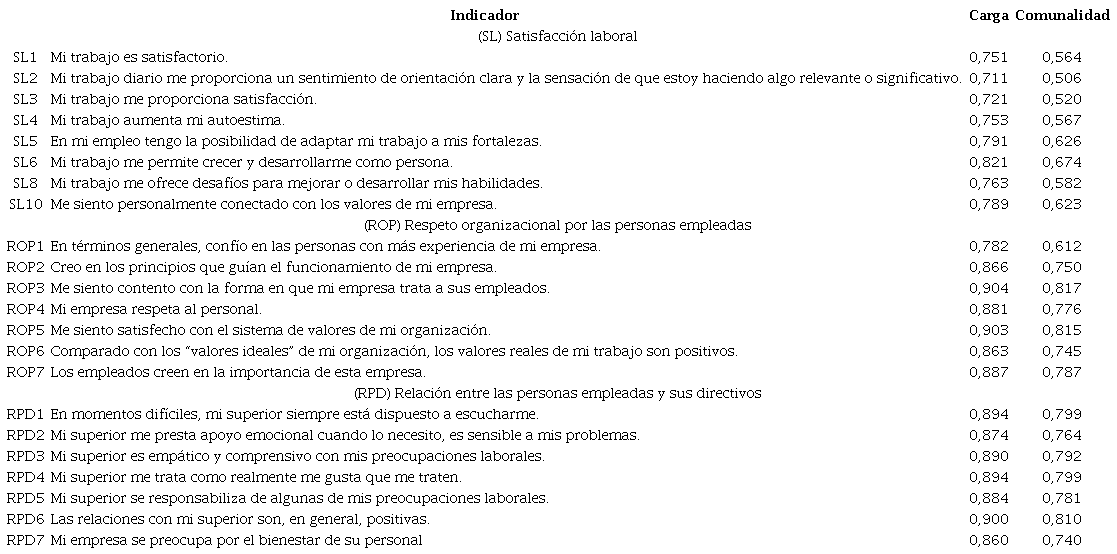 De este modo, en cuanto al modelo configurado para el caso del bienestar laboral, sus indicadores (o variables observadas) se evaluaron mediante las cargas factoriales, considerando aceptables todos aquellos indicadores con valores superiores a 0,708 ( Hair et al., 2017). Así, este límite está establecido por la comunalidad del elemento (λ2), la cual expresa la varianza de un indicador explicada por su constructo ( Carmines & Zeller, 1979).