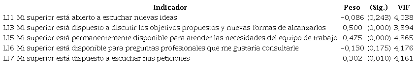 Así con todo, la Tabla 5 presenta los pesos externos y valores VIF de los indicadores que forman parte del constructo. Hay que señalar que los indicadores LI2, LI4, LI8 e LI9 no han sido considerados para formar parte del modelo debido a que presentaban valores VIF superiores al valor 5.