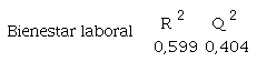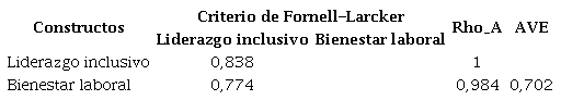 Tercero, la validez discriminante, con la que es posible medir, en el caso de varios constructos reflectivos, la diferencia entre estos. Entre otras, la prueba de Fornell-Larcker ( Tabla 6) evalúa, mediante la AVE, la capacidad discriminante del modelo. Así, un modelo con elevada capacidad discriminante es aquel en el que la raíz cuadrada del AVE es superior que la correlación que este modelo tiene con cualquier otro ( Fornell & Larcker, 1981). En el caso de este estudio, la raíz cuadrada de AVE del constructo bienestar laboral (0,837) es superior al valor del índice de Fornell–Larcker para (0,774) para este mismo constructo.