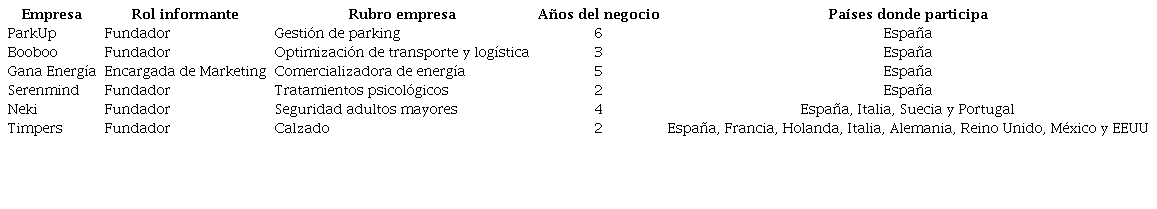 Finalmente se realizaron 6 entrevistas semiestructuradas (véase la Tabla 1). Las preguntas incluían cuestiones referentes a como desarrollan su negocio, como crean valor social/ambiental tanto de forma individual como en el contexto del clúster, como aprecian las ventajas y beneficios de pertenecer a un clúster, como se comunican con las empresas del clúster y como se relacionan con clientes, empleados, proveedores y competidores. Las entrevistas fueron grabadas y posteriormente transcritas a un procesador de texto donde fueron analizadas. Las entrevistas tuvieron una duración de 18 a 30 minutos y fueron realizadas, debido a dificultades generadas por la crisis del coronavirus, por videollamada utilizando plataformas como Zoom y Google Meet.