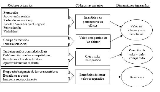 El análisis de las entrevistas permitió agrupar la información en un sistema de códigos (véase la Figura 1) indicando como las empresas obtienen beneficios de participar en un clúster, como establecen sus relaciones y de qué forma, inconsciente o conscientemente crean valor y crean valor compartido. El análisis permitió observar patrones en la narrativa de los gerentes y fundadores de startups.