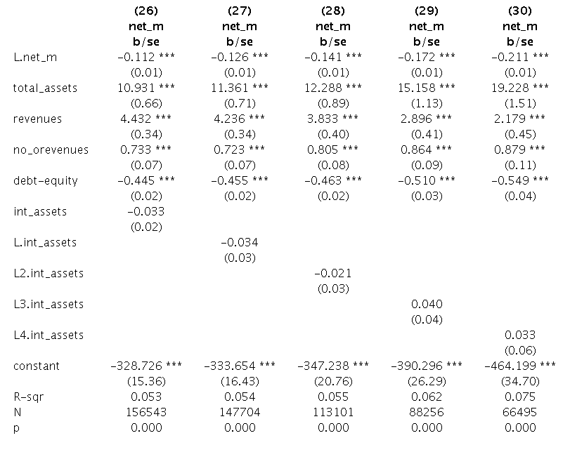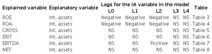 Tables 5, 6, and 8 show that the book value of IAs was not related to gross, EBIT or net margin in contemporaneous or lagged periods. Thus, IAs did not affect all outcomes in the firm. More research needs to be done to understand why there are profitability ratios affected negatively by IAs while other margins seem to be independent of those effects.