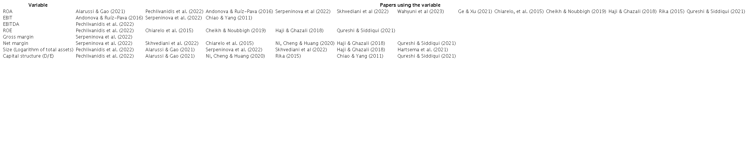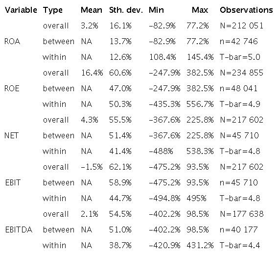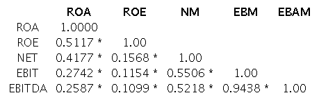 where ( Y it) represents independent variables including return on assets (ROA), return on equity (ROE), net margin (NM), the EBIT 2 margin (EBM), and the EBITDA 3 margin (EBAM). Table 1 shows a summary of the profitability ratios used in this study and their correlations; all these ratios were calculated by the authors using final year figures and were winzorised at the 99% level. Appendix B shows the relationship between the variables used and past papers which adopted them.