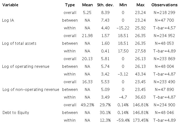 Despite this, the data is limited bearing in mind that it comprises 4.89 years per company and does not disclose the age of the firms. Therefore, the sample does not allow us to distinguish the five-year average observation of an established firm from an entrepreneurial young firm of five years-old or less, in which case we would expect there to be a differential in the capacity to exploit IAs and thus limits the scope of the results.
