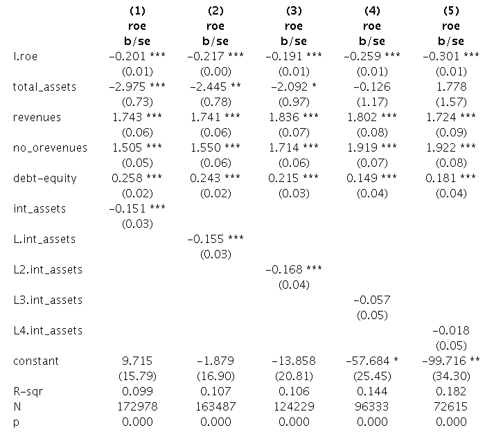Despite the literature having many papers on the relationship between IAs and profitability, ours adds to it in various ways. Firstly, little research about this link has been performed in Colombia or the rest of Latin America ( Andonova & Ruíz-Pava, 2016; Chiarelo et al., 2015); thus, analyzing Colombian company information using a panel data technique that has never been used to probe this relationship may shed new light on this topic. Secondly, we have found consistent evidence of a negative relationship between IAs and performance in the case of ROA (Return on Assets) and ROE (Return on Equity) for Colombian non-listed firms. Thirdly, this evidence is consistent with short- and long-term profitability measures. Fourthly, the relationship is consistent and robust to different measures of IA.
