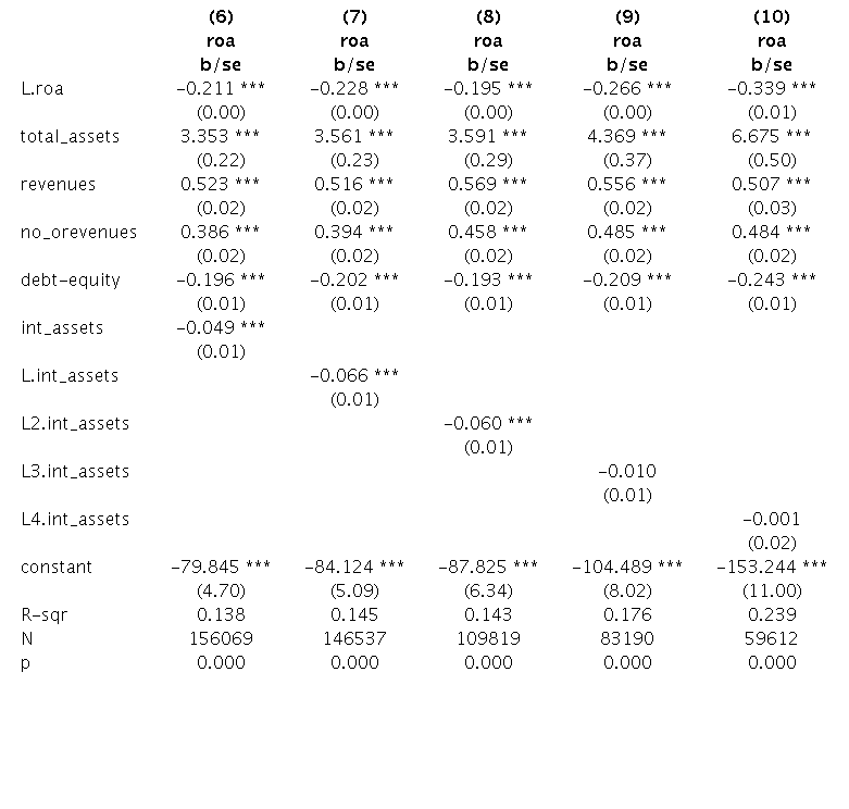 The effect of lagged IAs on ROE and ROA can be seen in Tables 3 and 4. One- and two- lagged IAs tend to be related to lower profitability. According to the previous explanation, the cost creation of IAs is higher than the profits obtained by the firm, even after two years. Although the amortization effect and the expenses related to the creation and registration of IAs may appear to explain this result, two years after registration, it does not seem logical that these expenses are the cause, whereas amortization does.