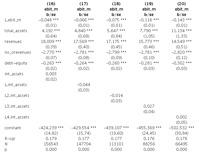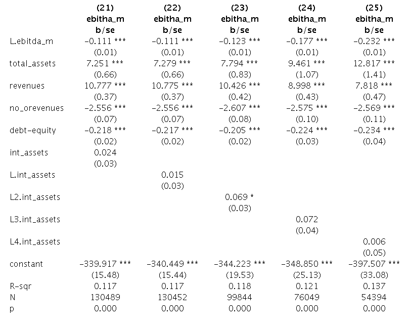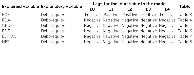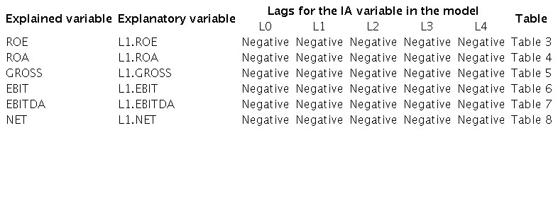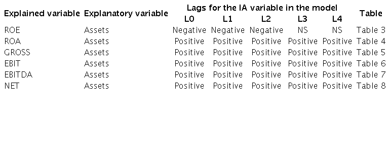 Table 7 shows the effect of IAs on the EBITDA ratio. After two lags, there was found to be a positive and significant relationship between both variables, which seems to be an isolated case as no other positive effects of IAs on a firm's performance could be appreciated; therefore, it could be said that the effect was negative or non-existent in the short term.