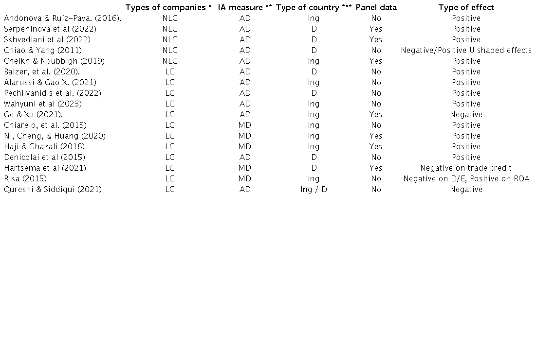 Given that the data used in our papers has come from Colombia, a developing country, we have focused on literature on this South-American nation as well as other developing ones like China, Brazil, Chile, Indonesia, Tunisia, Taiwan, Malaysia, Pakistan, and South Africa ( Alarussi & Gao, 2021; Andonova & Ruíz-Pava, 2016; Cheikh & Noubbigh, 2019; Chiarelo et al., 2015; Ge & Xu, 2021; Haji & Ghazali, 2018; Ni et al., 2020; Qureshi & Siddiqui, 2021; Rika, 2015; Wahyuni et al., 2023). In most of this literature, except for the Wahyuni et al. (2023) paper, authors have found a positive relationship between IAs and performance. Nevertheless, most of these papers have used data from publicly-listed firms, and only four of them have used panel data methods ( Cheikh & Noubbigh, 2019; Ge & Xu, 2021; Haji & Ghazali, 2018; Ni et al., 2020a). Appendix A shows the relationship between the papers reviewed and the effects of IAs on all the variables listed.