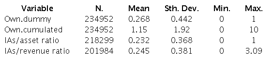 Following the methodology of Andonova and Ruíz-Pava (2016), we included a proxy of IA ownership that took the value of 1 if the company had an IA value higher than zero (Own. dummy). 27% of companies had positive IAs ( Table 9). We also incorporated a variable accumulating the value of the dummy variable for a specified number of years; companies had an average of 1.15 years of IA ownership with a maximum of 10 years, the total of the studied period.
