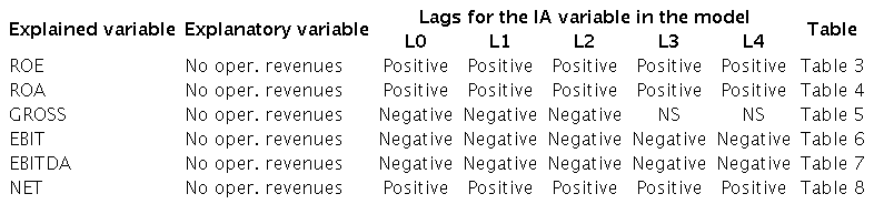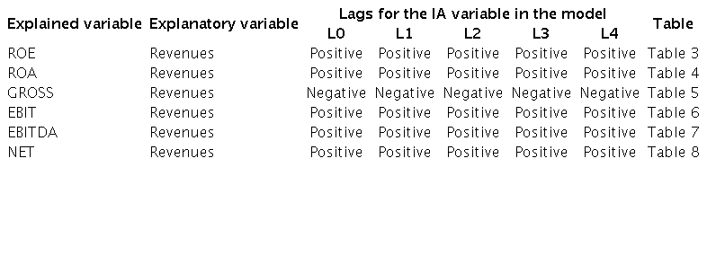Aside from this, several tables have been presented in Appendix C with abstract results of tables 3 to 8. In this appendix, the tables have been grouped by explanatory variables related to explained variables and the number of lags introduced in each model for the IA variable (from zero to four lags). Each model shows the explanatory variable having either a positive or negative relationship with the financial return variable and either a significant or a non-significant relationship with it.
