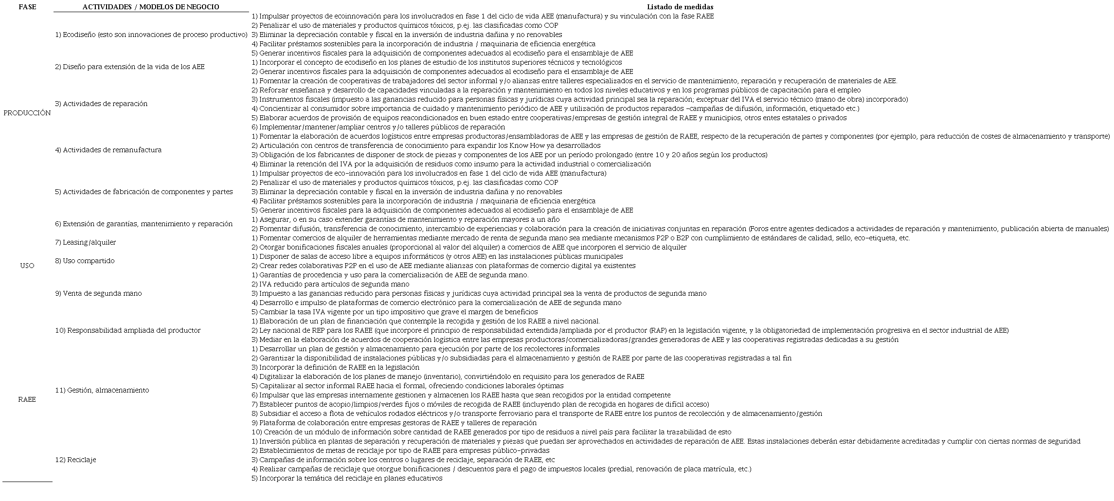 Con el objetivo de fomentar actividades y modelos de negocio circulares se propone un Policy Package que integra un conjunto de medidas factibles, complementarias y sinérgicas. La metodología Policy Packages ha permitido identificar un amplio abanico de medidas posibles, con sinergias entre ellas, que pueden facilitar el surgimiento e implementación de MNC, con un adecuado interfaz entre las estrategias gubernamentales y el sector empresarial en las diferentes fases de la cadena de valor de AEE. El tipo de medidas consideradas en el estudio, involucran de forma prioritaria al nivel federal, pero su implementación requiere también de la colaboración y adopción de medidas específicas por parte de los estados y los municipios, en particular, en las últimas fases (gestión de RAEE y reciclaje).