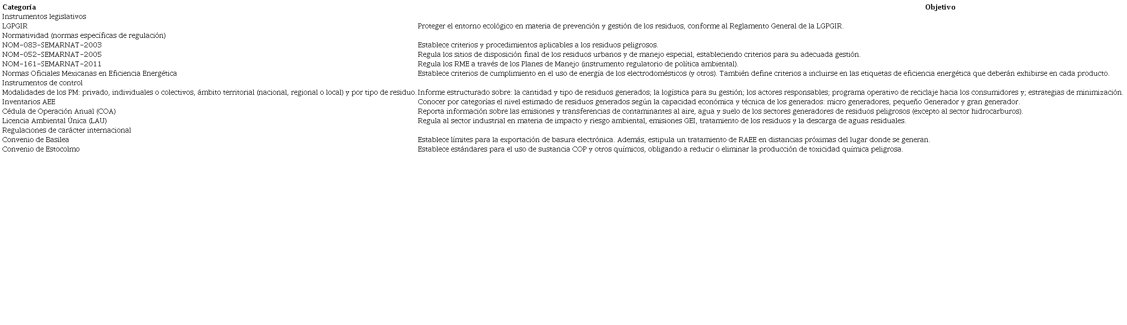 Conforme la SEMARNAT y el Programa de las Naciones Unidas para el Desarrollo (PNUD) ( 2019), la agrupación de los residuos electrónicos como RME supone obstáculos importantes para la implementación de los instrumentos y políticas ambientales. De hecho, la clasificación de los RME no coincide con la de los Convenios de Basilea y de Estocolmo puesto que una proporción importante de estos residuos contienen altos niveles de toxicidad para la salud humana (COPs, sustancias químicas y metales pesados), lo cual hace pertinente identificarlos como RP. Además, el último diagnóstico para la gestión integral de residuos ( SEMARNAT, 2020a, p. 130) menciona que “la lista proporcionada por la norma NOM-161 sigue siendo limitada, incompleta y desactualizada para identificar los residuos útiles para el reciclaje, e incluso, para definir con claridad las características del residuo, tanto para los generadores como para las autoridades encargadas de su vigilancia”.