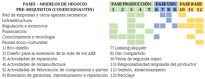 Las actividades relevantes para configurar MNC a lo largo de la cadena de valor de AEE son: 1) Ecodiseño; 2) Diseño para la extensión de la vida de los AEE; 3) Actividades de reparación; 4) Actividades de remanufactura; 5) Actividades de fabricación de componentes y partes; 6) Extensión de garantías, mantenimiento y reparación; 7) Leasing/alquiler; 8) Uso compartido; 9) Venta de segunda mano; 10) Responsabilidad ampliada del productor; 11) Gestión, almacenamiento; 12) Reciclaje.