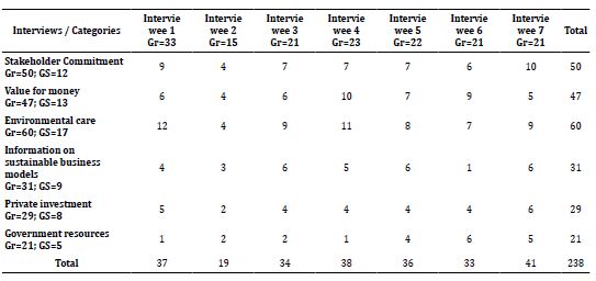 Therefore, six categories were determined: (1) stakeholder commitment, (2) value for money, (3) environmental care, (4) information on sustainable business models, (5) private investment, and (6) government resources. Next, Table 3 presents the occurrences of the interview codes versus the categories to provide an overview of the qualitative analysis performed.