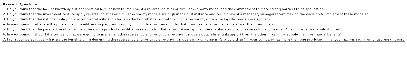 The survey questions for the interviews were determined according to the research of Dey et al. (2020), Frei et al. (2020), Oliveira et al. (2019) and Pal et al. (2019) and validated for the inductive development of the questions and answers regarding the barriers that MSC has with RL and the objectives of the CE ( Table 2).