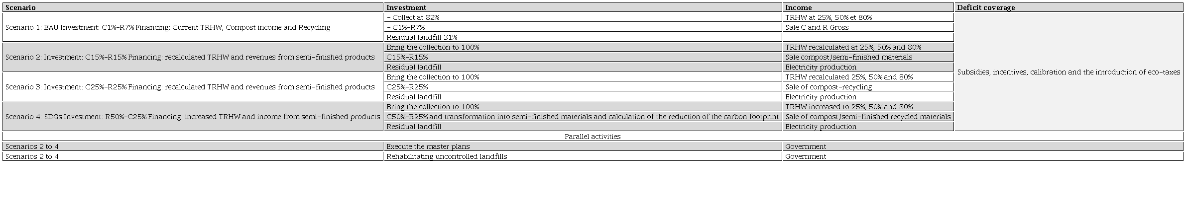 The economic and financial analysis of the NSIWM-2035 aims to financially balance the HSW sector and to analyze its expenses and revenues. It also proposes investment options, management, the valorization of composting and recycling, and the recovery of the sector’s costs by 2035. Doumani (2017) highlighted an estimate and a financial simulation ( Appendix 1) by making projections on the waste situation by 2035 in different scenarios: