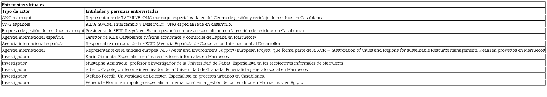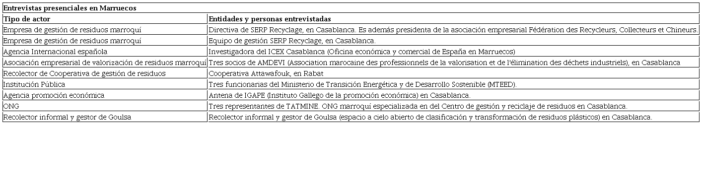 Las entidades seleccionadas en la muestra cualitativa son representativas del conglomerado de los diferentes actores sociales implicados en el incipiente desarrollo de prácticas de EC sobre gestión de residuos en Marruecos. En dicha muestra cualitativa se ha realizado el esfuerzo de integración de actores de diferente naturaleza y especialmente representativos, como el caso de la asociación empresarial Fédération des Recycleurs, Collecteurs et Chineurs, creada en 2021 para promover el sector de la gestión y valorización de residuos, garantizar la ejemplaridad de sus agentes, defender sus intereses económicos y la inclusión social de los recolectores de residuos (FEDERCC, 2021). Esta federación integra a otros actores nacionales importantes, también entrevistados, como la Asociación Marroquí para la Valorización de Residuos Industriales (AMVEDI, por sus siglas en francés) y la cooperativa Attawafouk de Rabat, considerada un ejemplo de integración exitosa de los recolectores de residuos en el trabajo formal ( Ez-Zaouine y Elouidani, 2019).