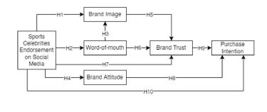 As explained in the literature, several models have tried to explain the consequences of celebrity endorsement ( Febrian & Fadly, 2021; Herjanto et al., 2020; Khan & Zaman, 2021), but there is no model to explain the impact of sports celebrity endorsement on purchase intention through brand image, word of mouth, brand trust, and brand attitude. Therefore, this research aims to understand the impact of Sports celebrity endorsement on social media and purchase intention. To this end, the following model ( Figure 1) has been proposed.